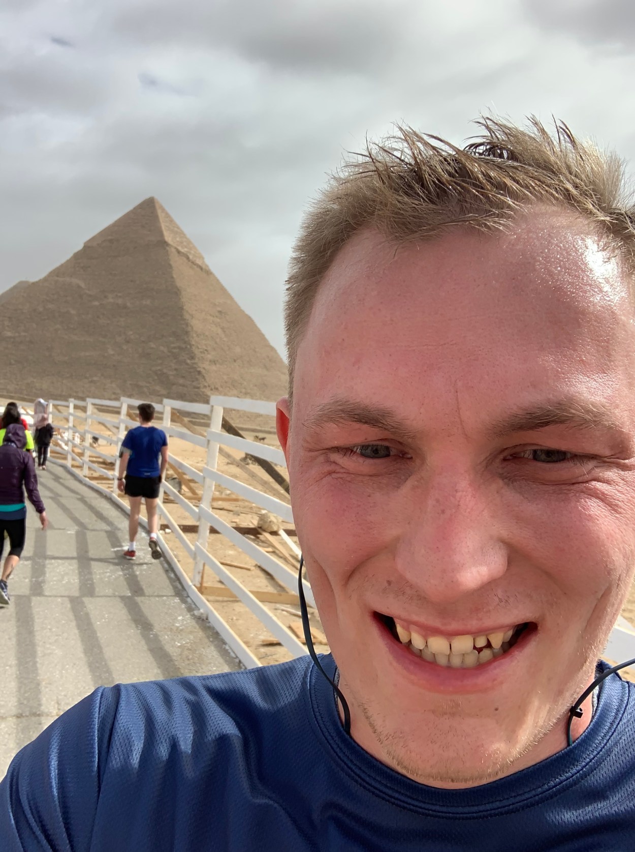 Wie der Name schon sagt, fand der Lauf direkt an den Pyramiden statt und sollte um 8 Uhr losgehen. Und da hier in Ägypten auch gerade Winter ist, war es dann doch recht frisch. Highlight vor dem Lauf, war das halbstündige Anstehen an den Toiletten für Männer. Die nichtvorhandene Blase bleibt also auch nach der Schulzeit bei Ägyptern erhalten. Aber nach kurzer Erwärmung ging es dann endlich los. Nach dem Start musste ich erstmal zusehen, dass ich schnellstmöglich an die ganzen 10 km Läufer oder besser gesagt Spaziergänger vorbeikomme. Denn viele haben den Lauf als eine Möglichkeit für einen gemeinsamen Spaziergang interpretiert. Ansonsten lässt sich sagen, dass meine Vorbereitung auf dem Laufband, wie zu erwarten war, nicht optimal war. Zum Einen war die Strecke eher ein Ständiges auf und ab und zum Anderen läuft es sich auf Asphalt dann doch anders als auf dem Laufband. Nichtsdestotrotz fühlte ich mich ziemlich gut. Erlebte dann sogar von Kilometer 11 bis 14 ein wahres Hoch. Überholte einige Läufer und ging im Kopf schon die Siegesose für den Zieldurchlauf durch. Jedoch stellte ich bei Kilometer 14,5, einem U-Turn fest, woher das Hoch kam. Ich hatte einfach unglaublichen Rückenwind und es ging leicht bergab. Somit war es bis Kilometer 19 nun eine leichte Qual: ständig bergauf und immer stärker werdender Wüstenwind. Aber ich hatte so viel Kraft übrig, dass ich die letzten beiden Kilometer nochmal das Tempo erhöhen und noch einige Läufer überholen konnte.