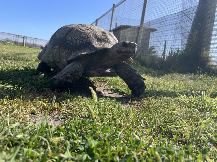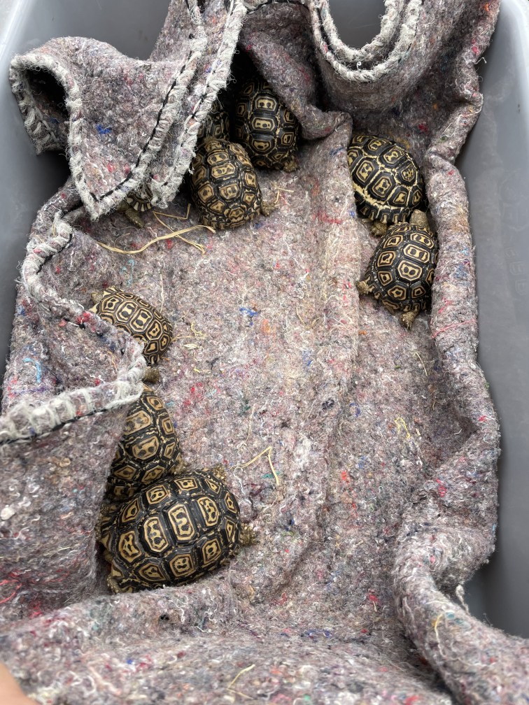 Insgesamt haben 21 Schildkröten, der Gattung der Leopard-Schildkröten. Jetzt fragt man sich natürlich warum wir Schildkröten haben, den so wirklich passen sie nicht zu unseren Geparden und unserem Hundeprogramm. Kurz begründet sie wurden gefunden und sind nicht unbedingt heimisch hier, deshalb brauchten die ältesten beiden eine neue Heimat. Und da wir die Möglichkeiten hatten, haben wir sie aufgenommen. Unsere ältesten beiden sind Speedy und Gonzalez. Und auch wenn die beiden Namen es nicht unbedingt offenbaren, es sind ein männliches und ein weibliches Exemplar. Demzufolge sind die anderen 19 Schildkröten ihre Kinder. Wir haben dabei 8 Schildkröten im Alter von 5 bis 7 Jahren auch genannt: Mediums oder Jugendliche. Und dann haben wir noch unsere Babies. Insgesamt 11 Stück im Alter von 3 Jahren bis 6 Monaten.