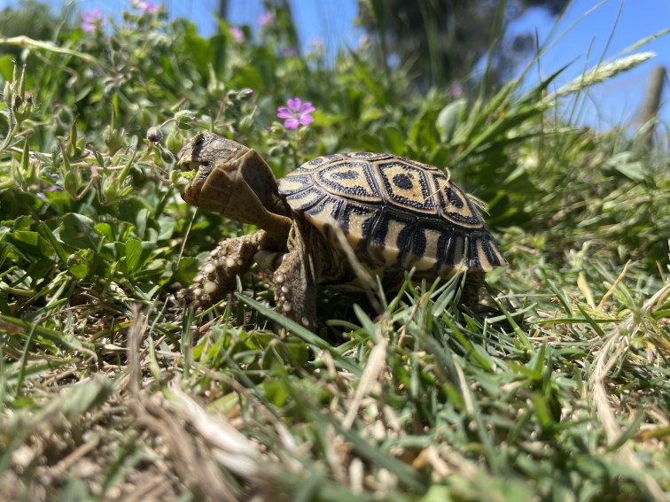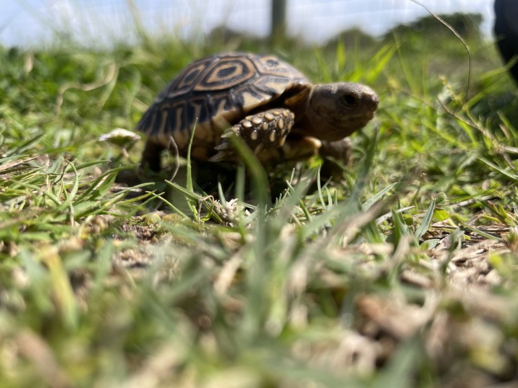 Die Leoparden Schildkröten ist die viergrößte Landschildkrötenart und die Exemplare können bis zu 20 kg erreichen, was Speedy und Gonzalez auch schon erreicht haben. Die Lebenserwartung beträgt bis zu 80 Jahre. Die Leopardenschildkröte gehört im übrigen zu den Small Five. Jeder kennt ja sicherlich die Big Five (Löwe, Leopard, Elefant, Büffel, Nashorn), welche bei Safaris gesehen werden können. Aber auch die Small Five sind eines Blickes würdig, die weiteren Mitglieder des Small-Clubs sind die Nashornkäfer, die Büffelweber, die Elefantenmaus und die Ameisenlöwen. Ihr erkennt sicherlich die Korrelation der Namen. Leopardenschildkröten gelten eher als schüchterne Schildkröten, was auch ganz gut auf Gonzalez zutrifft. Aber Speedy? Nie im Leben. Speedy macht seinen Namen alle Ehre und hat vermutlich zu oft in die Nachbargehege geschaut und glaubt nun ein Gepard zu sein oder so. Auf alle Fälle ist er nicht schüchtern. Im Normalfall erreichen Schildkröten wenn sie „sprinten“ Geschwindigkeiten bis zu 1 km/h. So haben wir vermutlich das schnellste Tier der Erde hier und eines der langsamsten (Sorgt immer für einen Lacher, wenn ich Touren gebe). Aber Speedy, easy peasy kommt er auf 1,3 km/h. Leider wurde mir noch nicht erlaubt, ihn für einen Guinness Buch der Rekorde anzumelden. Der aktuelle Rekord liegt bei 0,28 m/s, gehalten von Bertie, einer Leopardenschildkröte.