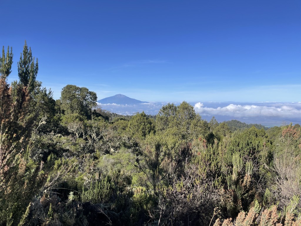 Auf dem Weg nach oben hatten wir immer mal wieder eine gute Sicht auf die Umgebung, da keine Wolken waren. Und nach einem recht steilen Aufstieg hatten wir dann einen wunderschönen Blick auf den kleinen Bruder des Kili: Mount Meru. Und ich benutze das Wort Bruder ganz bewusst. Dem alten tanzianischen Glauben zu Folge gab es ein Bruderpaar als Gottheit, deren Namen Siril und Aldina. Um diese beiden Götter um einen Gefallen zu bitten musste man jeweils ein Gebet auf der Spitze des Meru und des Kili machen. Diesen beiden stellten also die irdische Verbindung zum göttlichen Bruderpaar dar und waren somit auch als Brüder angesehen. Dabei stellt der Meru den kleineren Bruder mit seinen 4566 m dar. Ob das wirklich als klein zu beziffern ist, weiß ich nicht. Ich meine, das ist relativ nah dran an der Höhe des Mount Blanc, was immerhin der höchste Punkt Europas ist. Aber sein Anblick war sehr cool.