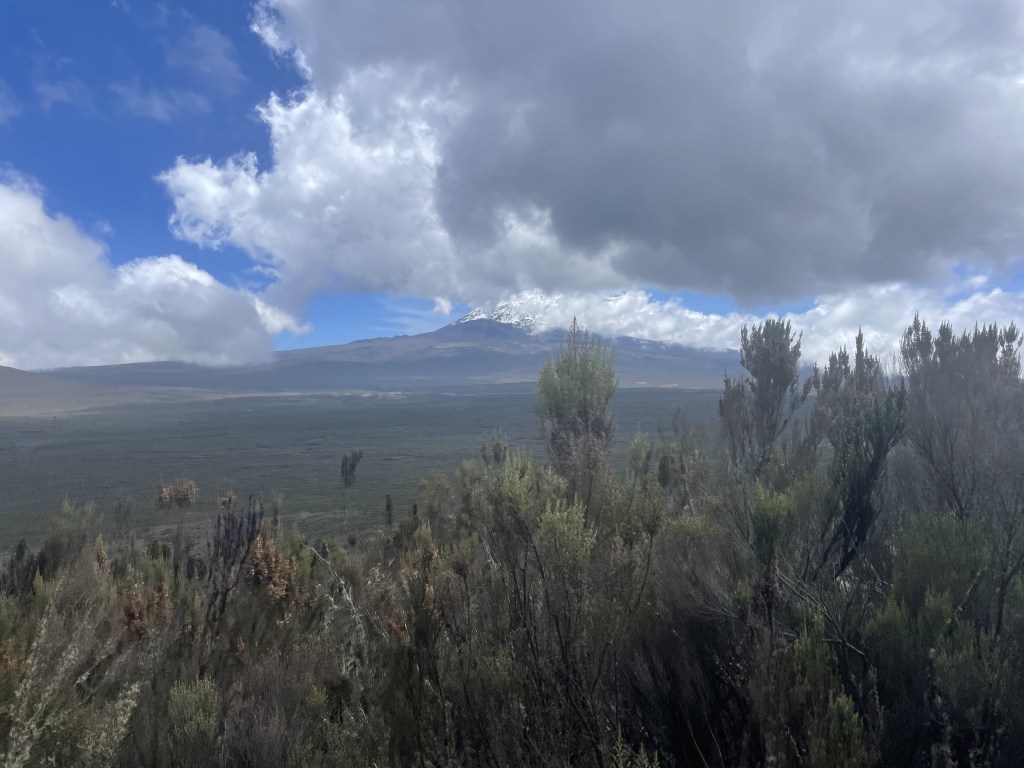 Nach einer Weile haben wir dann den Wald verlassen und kamen in eine Moorlandschaft, zumindest den Schildern nach. Dabei änderte sich die Wetterlage auch drastisch, war am Anfang keine einzige Wolke zu sehen, entwickelte sich innerhalb von einer halben Stunde aus einer kleinen Schäfchenwolke, eine Wolkenherde aus Büffeln. Wie auch immer aus einem kleinen Lämmchen eine Herde aus Büffel werden soll. Und mit einmal war der gesamte Himmel bedeckt. Bakari meinte vorher noch das wir wenn wir Glück haben, einen Blick auf den Blick des Gipfels bekommen. Aber ich kleiner Sonnenschein oder Glücksbärchi hatte natürlich wie immer das Glück der Doofen und unmittelbar bevor wir um die Ecke gebogen sind, riss die Wolkendecke ein wenig auf. Und ich konnte die Spitze oder besser das Gipfelplateau sehen. Unfassbar nah und doch so weit entfernt, immerhin war ich noch 2500 Höhenmeter unterhalb des Uhurupeak. Aber es war unglaublich schön. Den ersten Moment, bei dem die Sicht auch noch am besten war, habe ich keine Fotos gemacht und habe es nur genossen. Auf den Bildern hatte es sich dann schon wieder ein wenig zugezogen. Wisst ihr woran mich der Gipfel mit seiner weißen Spitze erinnert hatte? An diese Milka Mountain Schokolade die es mal vor ein paar Jahren gab, aber irwie nicht mehr. Ich habe die immer geliebt. Vielleicht kommt daher meine Zuneigung zu Bergen? Wer weiß.