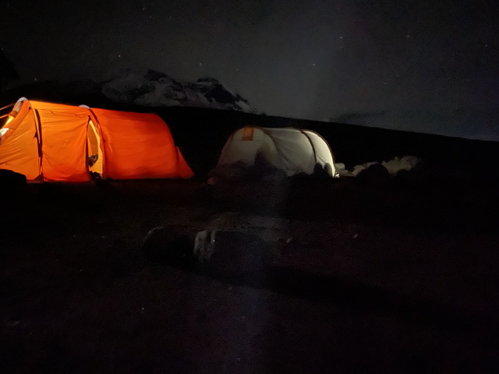 Gerade beim Zähneputzen und Pipi machen, habe ich dann nochmal was wundervolles gesehen. Alle Wolken waren weg und ich hatte einen unfassbaren Sternenhimmel über mir. Und die Lichter der Städte in weiter Ferne. Es war so schön. Und im Dunkeln konnte ich dann auch wieder die beeindruckende Spitze ausmachen, dass sich wie ein Ungetüm aus der Dunkelheit hervorhob. Und ich konnte dieses nicht ganz so tolle, aber immerhin passable Foto machen. Ich hätte stundenlang da sitzen können. Aber ich befürchtete zum nächsten Yeti zu werden und anzufrieren. Es ist nämlich verdammt kalt über Nacht. Aber auch am Tag, wenn man sich nicht bewegt.