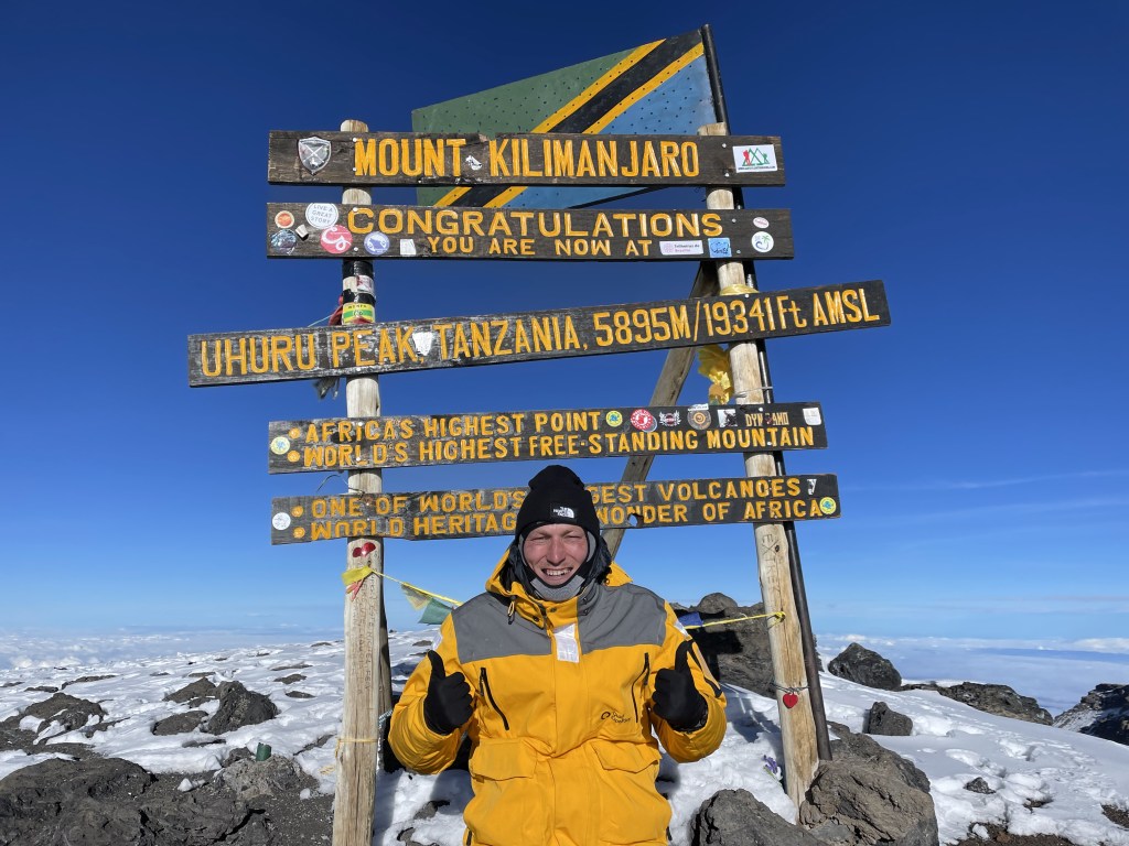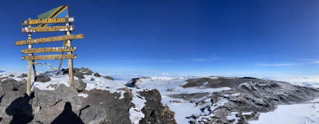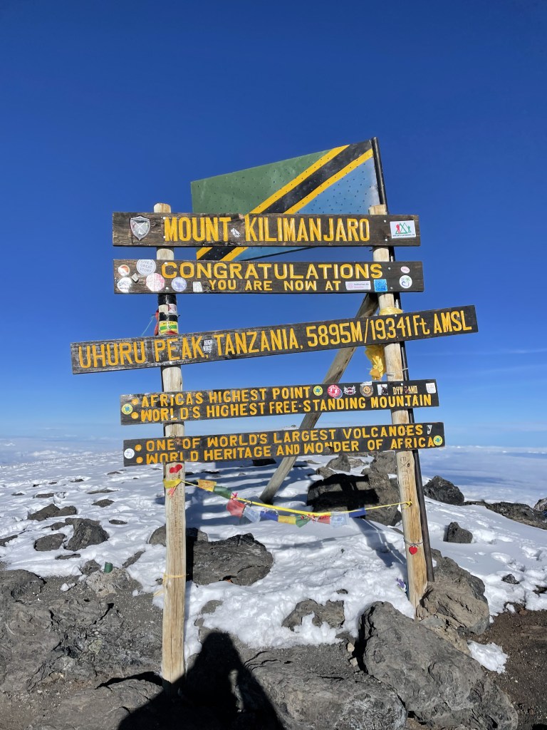 Zum Start fühlt es sich wie eine Ehrenrunde an. Nur das Publikum welches applaudiert und laut meinen Namen skandiert fehlt. Ich glaube, in dieser Höhe wäre das auch merkwürdig. Kurz nach dem Start, merke ich, dass ich es geschafft habe. Ich weiß nicht genau warum da und warum genau in diesem Moment. Aber es ist der Moment in dem ich realisiere, dass ich auf dem höchsten Punkt Afrikas stehe. Das ganze in Worte zu fassen, fehlt mir selbst jetzt noch schwer. Ich bezweifle auch, dass ich jemals in der Lage sein werde, dies in Worte zu fassen. Es ist einfach unfassbare Freude, gepaart mit Stolz und Zufriedenheit. In der Sekunde meines größten Triumphes vergesse ich leider nur, dass noch 1 km am Ende und 100 Höhenmeter vor mir liegen und auch wenn diese deutlich flacher sind als die davor, in knapp 6000 Meter zieht sich das ganz schön in die Länge. Ungefähr 30 min brauchen wir dafür. Aber mit jedem Schritt weiß ich, dass ich dem Ziel näher komme und mich nur noch ein Wunder stoppen kann. Und endlich, nach einer langgezogenen Rechtskurve erkenne ich das Schild. Die letzten Meter laufen sich allein.