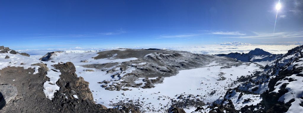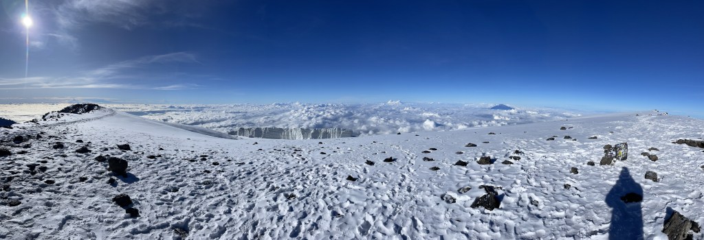 Ein Punkt des Kraters liegt ungefähr 100 m unter dem Uhuru Peak. Wir machen kurz Pause und gratulieren uns. Ich spendiere eine Runde M&M’s. Ich kann glaube kaum beschreiben, was in mir vorgeht. Es einfach ein wunderschöner Moment. Bacari motiviert mich weiterzugehen, damit wir auch an der höchsten Stelle ankommen. Man kann bereits das Schild erkennen. Eigentlich sieht es gar nicht so weit entfernt aus.